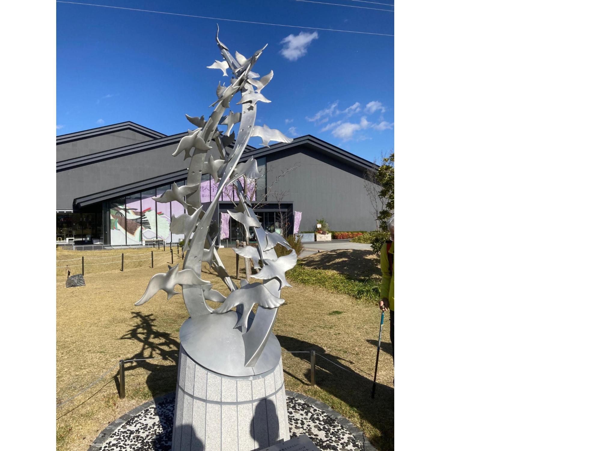 予定ではさわらびの道から入山しようと思っていたのですが、狭い道で観光客等で混雑が予想されたため、もう1筋北の筋からのルートを行くことにしました。此方は歩いている人がほぼいなくて源氏物語ミュージアムを左方向に臨みながら坂道を登って行きました。予想外の急な坂が続いて、息を切らながら、休みながらの行程となりましたが歩いた距離も時間も短かったように感じました。しかし、たどり着いた展望台では想像もしていないくらいの冷たい風が吹き荒れていて、ゆっくりと昼食休憩とはなりませんでした。
