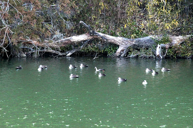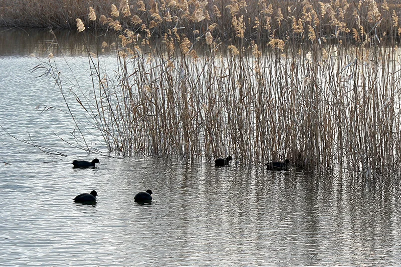 水面が水鏡となり黄金色に染まったところにマガモ・ホシハジロ・カイツブリなどの水鳥も集まり始めていました。