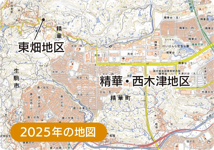 2025年の地図は、開発によるけいはんな学研都市の誕生後の地図です。学研都市の誕生で東畑の周辺は大きく変わりましたが東畑は大きくは変わらず、その景観を今に伝えます。それでもいろんな変化がありました。