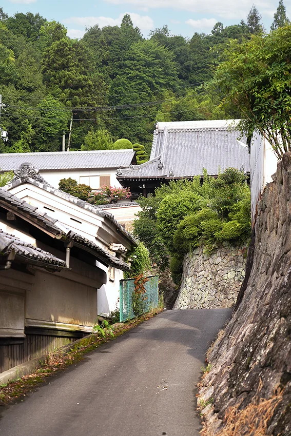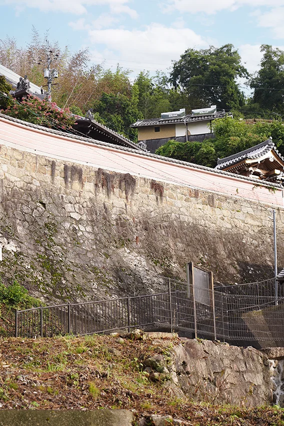 府道を横切り、かつての造り酒屋の前を過ぎると、右手にお城のような高い石垣がみえます。専光寺の石垣です。見上げると、よく崩れないなあ!と感心します。