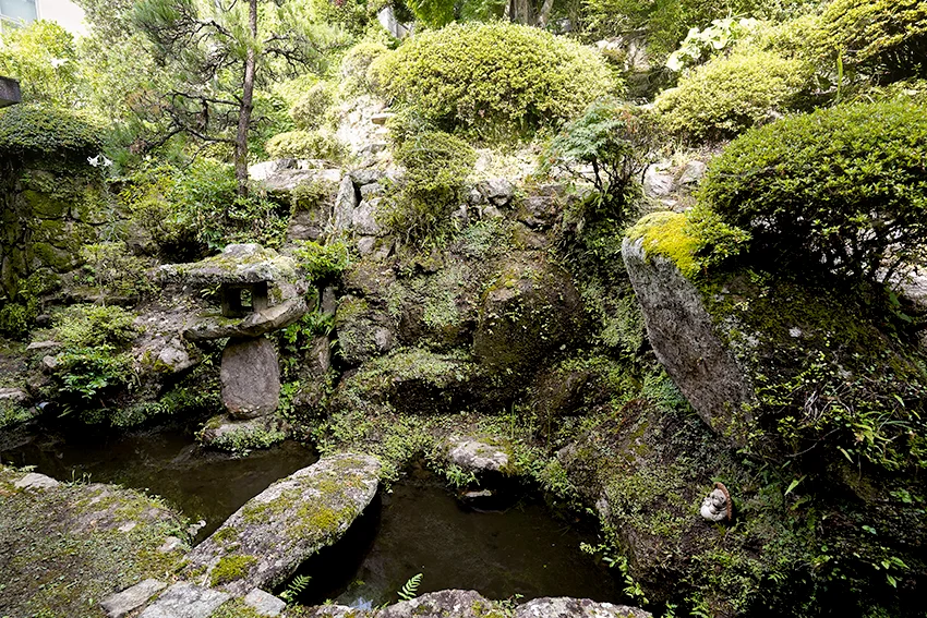 境内は高い石垣の上にあり、塀越しに遠景が一望できます。また、本堂の裏側は急な斜面になっていて、岩肌を生かした大きい庭園がつくられています。