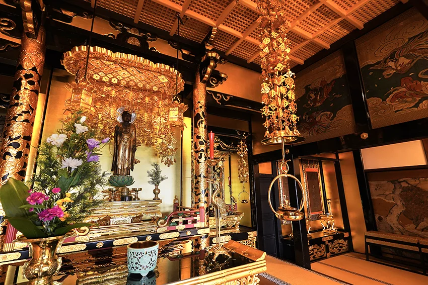 門をくぐると先ず目につくのは広くて大きな屋根の本堂で、京都府暫定登録文化財に登録されています。本堂内に入ると、内陣中央に「阿弥陀如来立像」が、両脇の余間には親鸞聖人を初めとした掛軸が掛けられています。また、江戸時代後期の作とみられる鶴図(2面)と孔雀図(4面)の襖絵があります。