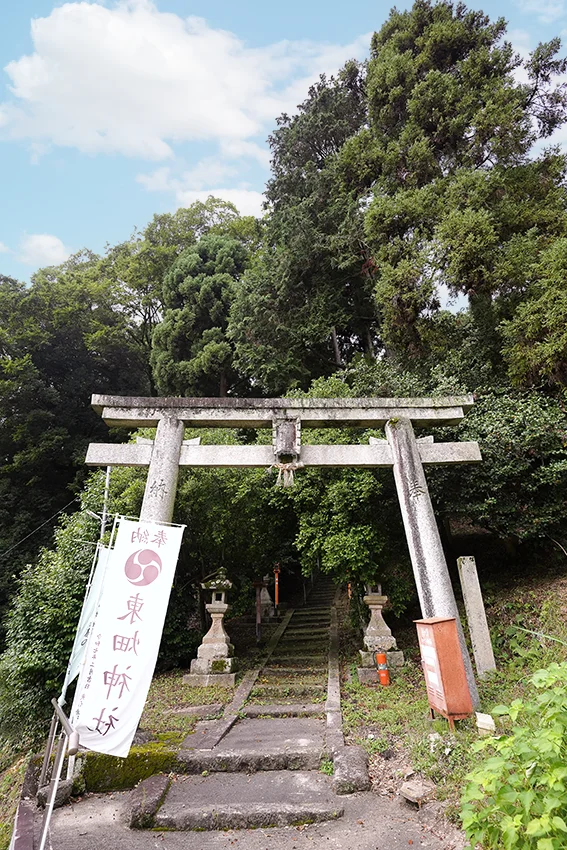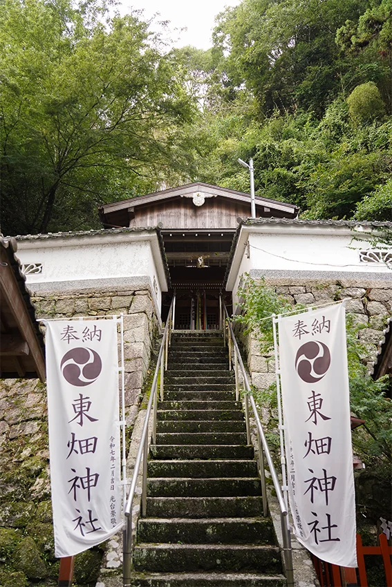 専光寺からは徒歩2、3分で東畑神社の西の鳥居が見えます。正面の鳥居は東側にあり、くぐると急な石段で、それを上った先が境内です。専光寺と同様、嶽山の麓につくられています。