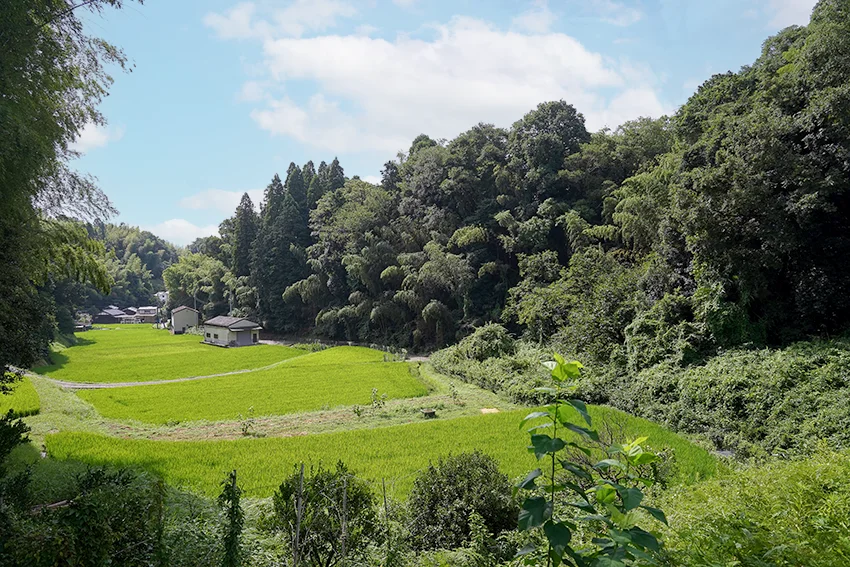神社の境内からの眺めは専光寺とはガラっと変わります。二つの尾根に挟まれるように30軒ほどの家が建っています。「北ノ谷」地区です。